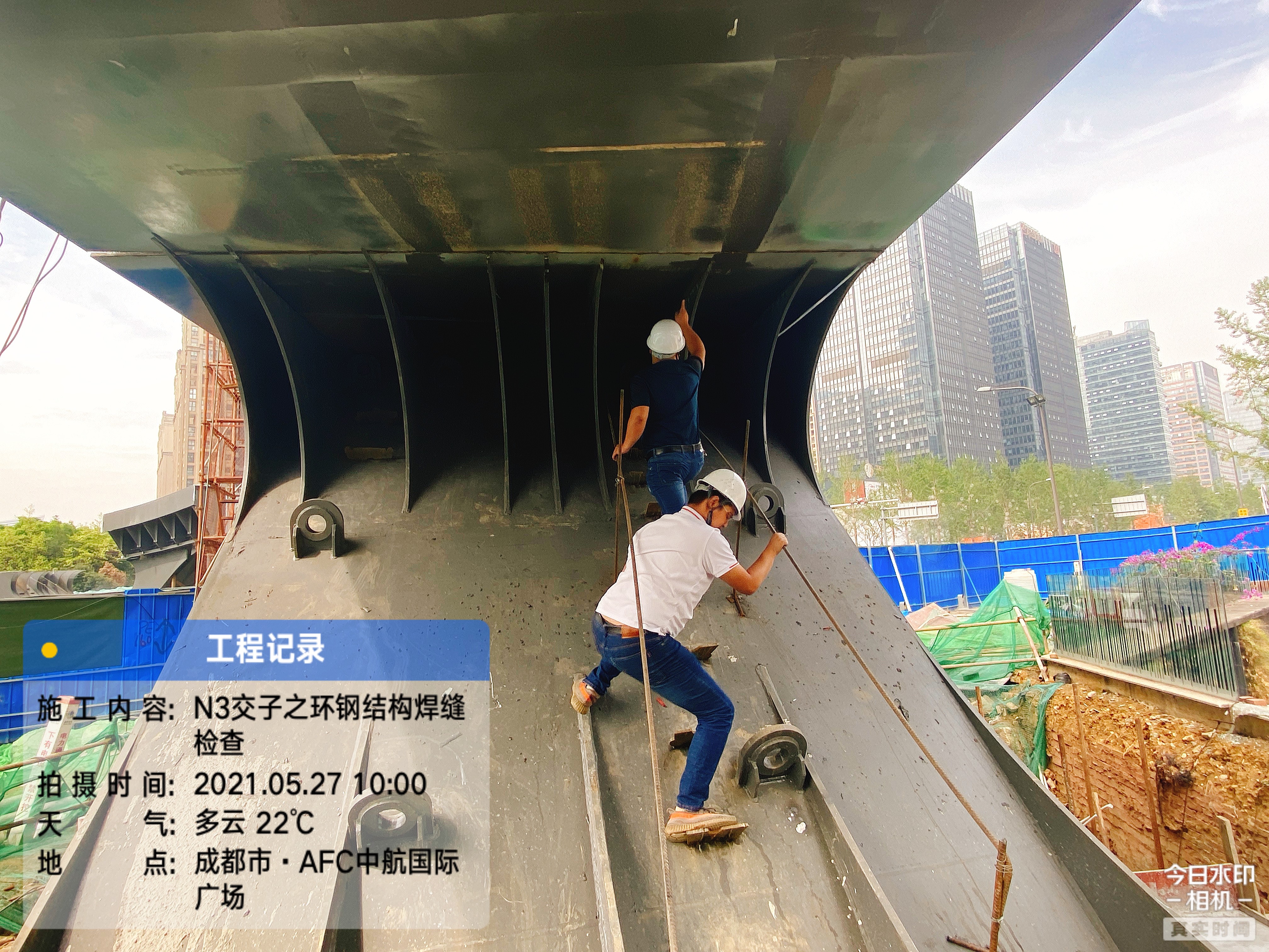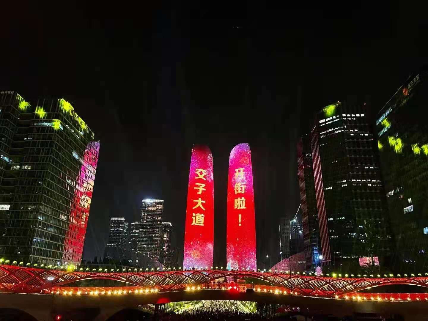 交子之環(huán)大橋內(nèi)直徑達(dá)96米,外直徑達(dá)114米,鋼結(jié)構(gòu),總重量達(dá)3274噸,集通行、休閑、商業(yè)等多功能為一體的多元場景的人行天橋。在施工過程中采用了三維數(shù)字模型、焊接機器人仿真模擬焊接等新工藝,加大了監(jiān)督管理的難度。